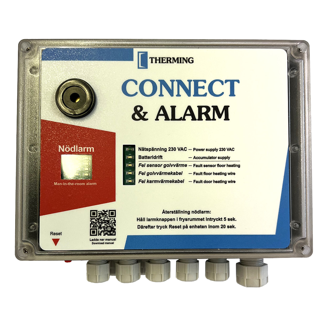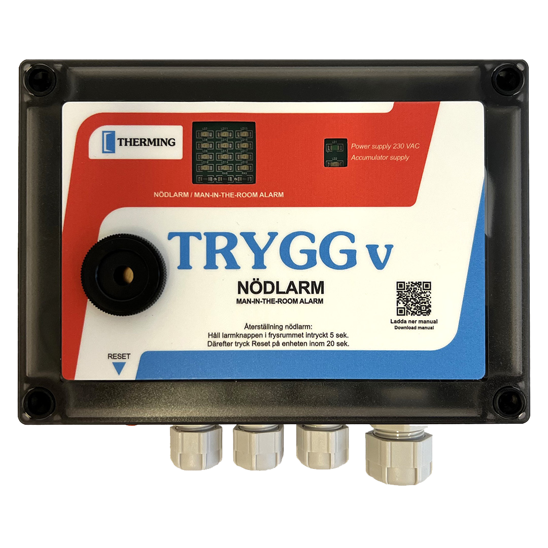 Therming Trygg V med batteridrift säkerställer samtliga larmfunktionen i upp till 24h från ett strömavbrott.