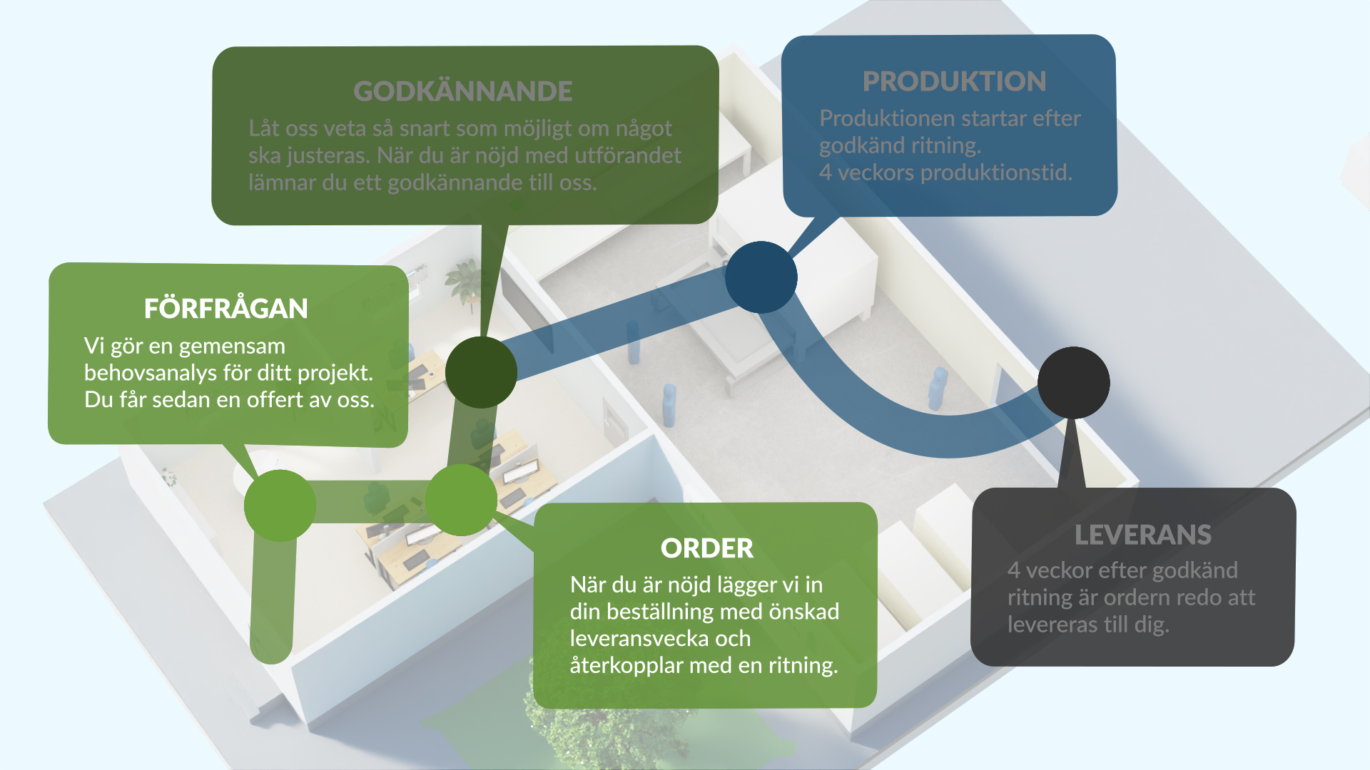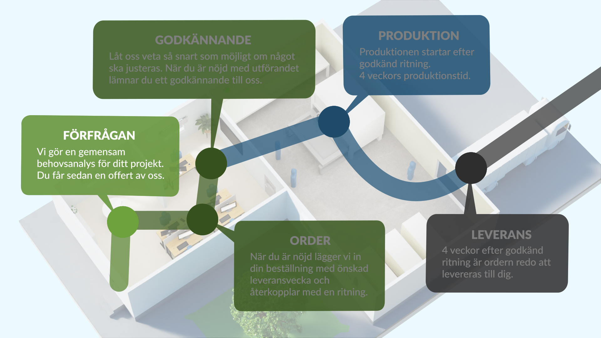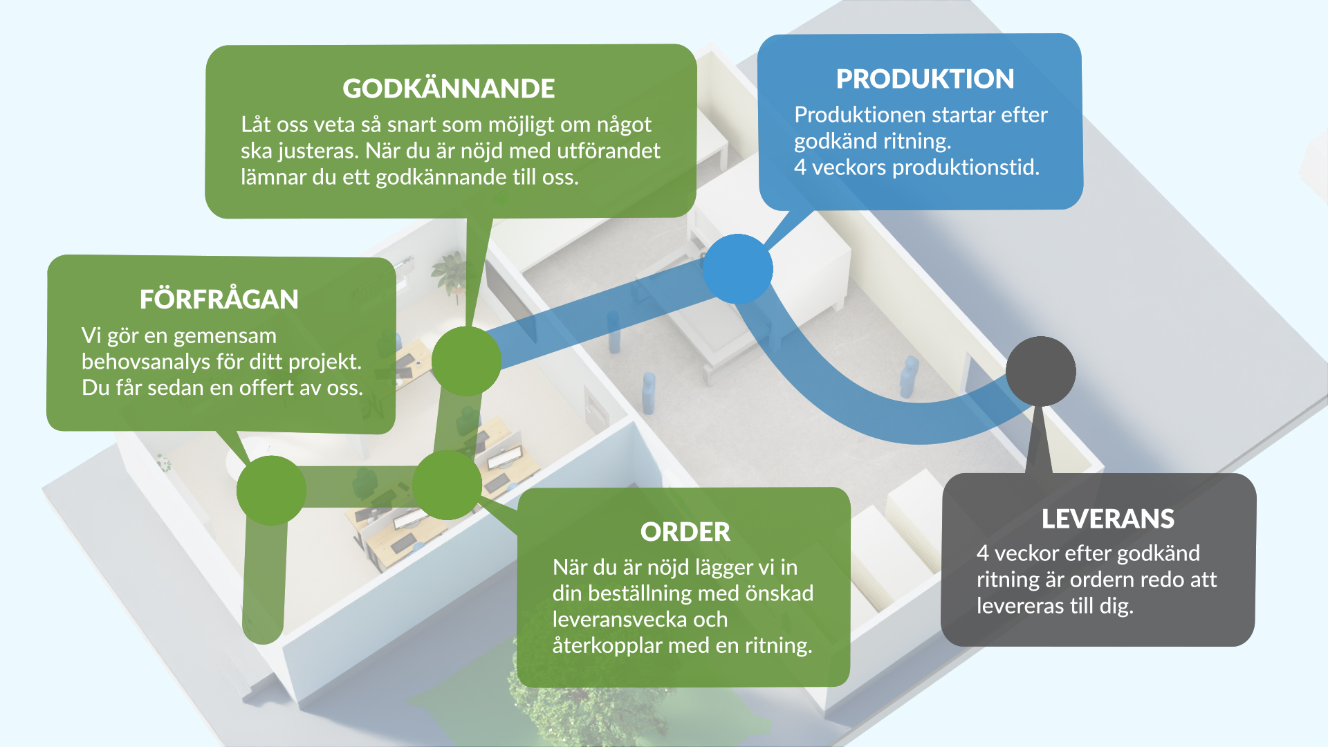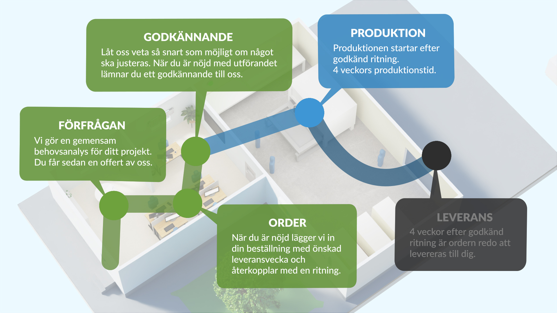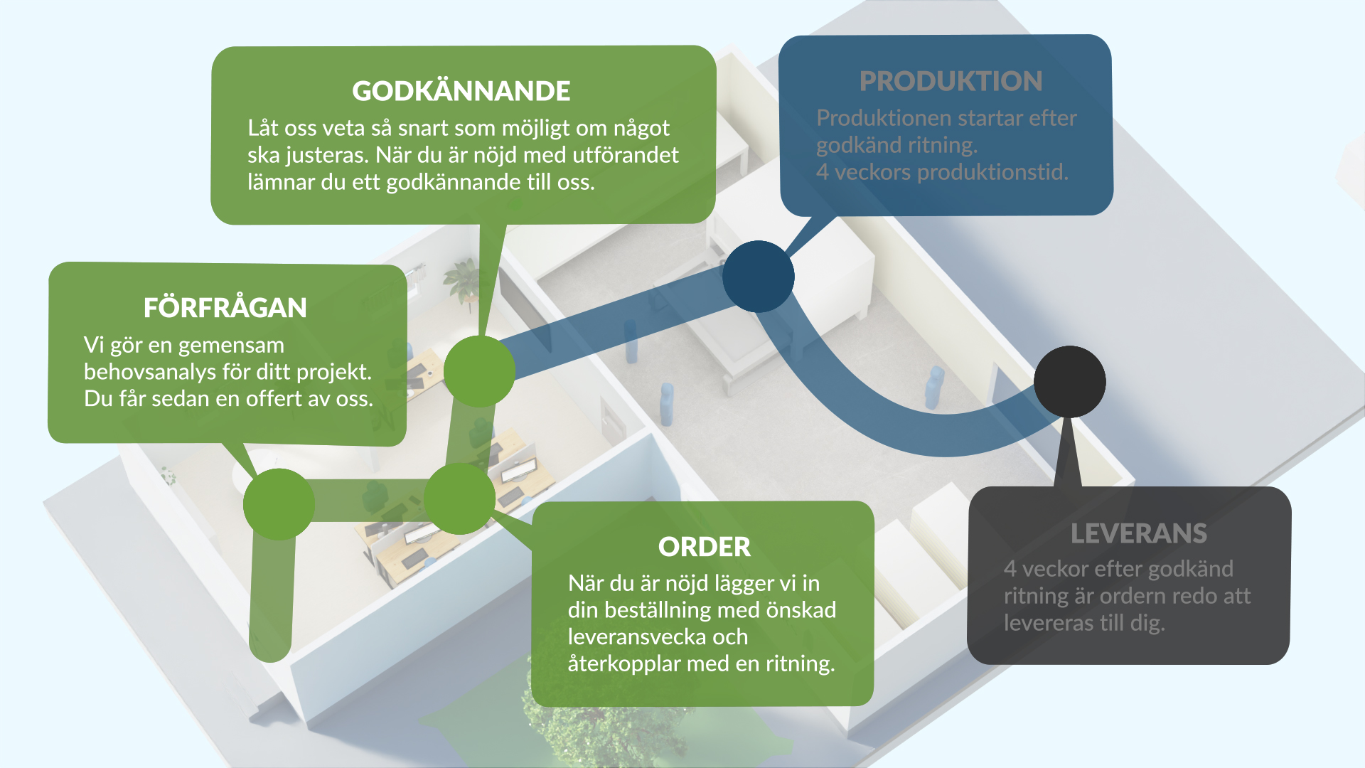För att du som kund på bästa sätt ska kunna planera ditt projekt, vill vi på Finnebäcks förtydliga vårt arbetssätt. Mycket i vårt arbete bygger på en bra dialog med dig som kund då varje projekt är unikt. Samtidigt håller sig (nästan) alla projekt inom de fem stegen: förfrågan, order, godkännande, produktion och leverans.